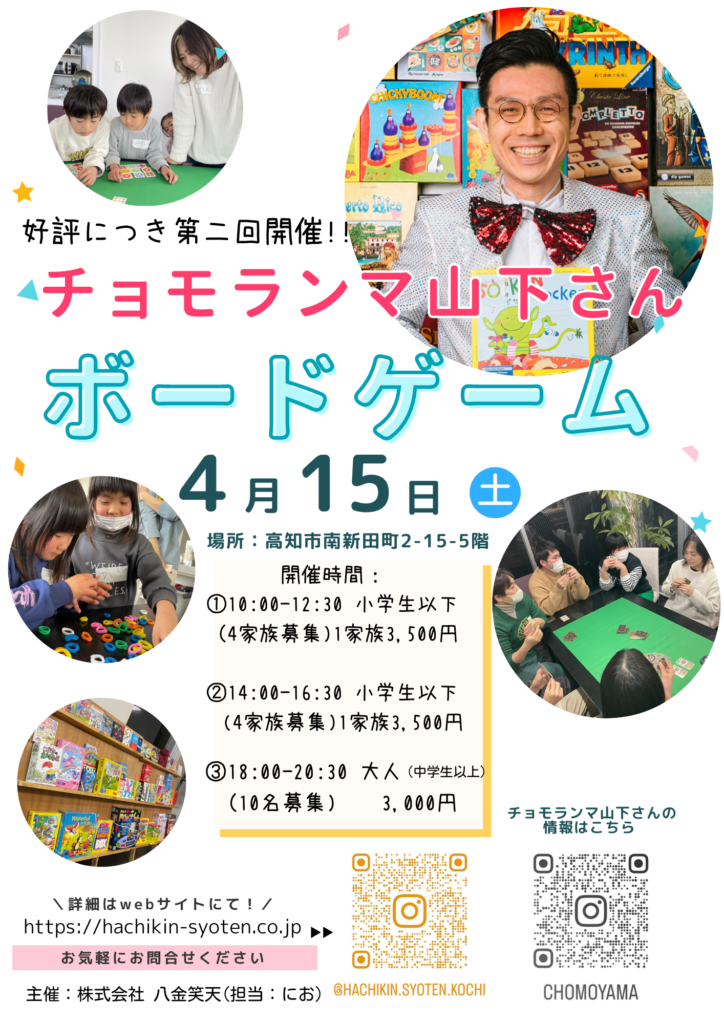 イベントポスターを置かせていただきました! 投稿日: 2023年2月15日 投稿者: 八金笑天 こんにちは😊 なんと嬉しいことに、4/15開催のチョモランマ山下さんのボーゲームイベント ポスターを貼らせていただくことになりました^^ DRUG MAC 竹島店様、快く置かせていただきました😊 続きまして、 よどやドラッグ 塩屋崎店様、こちらも快く承諾いただきました^^ そしてそして、 DRUG MAC 南国店様 ありがとうございます^^ ぜひお近く方、見つけてくださいね^^ たくさんのご参加をお待ちしております。お申し込みは、こちらのHPお問い合わせからお知らせください✨